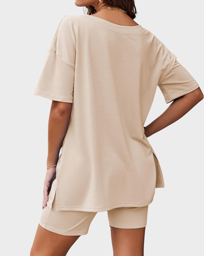 Slip into effortless comfort and confidence with this summer-ready 2-piece loungewear set. Designed to flatter all body types, the deep V-neck oversized tee and curve-hugging biker shorts are perfect for lounging, layering, or stepping out in style. Soft, breathable, and incredibly versatile—you'll never want to take it off.