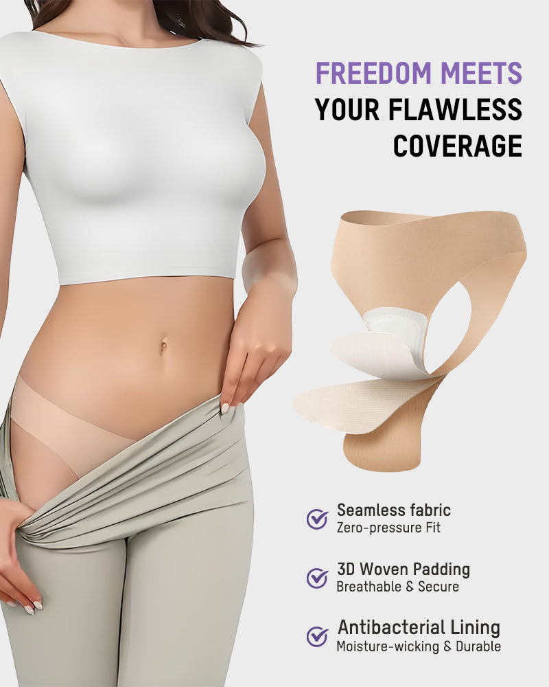 Our innovative thongs are designed with a built-in camel toe cover pad, seamlessly integrated to ensure complete discretion under even the tightest yoga pants or leggings. The secure, non-shift design keeps the pad perfectly in place all day—no slipping, no sliding, no matter how you move.From intense gym sessions and mindful yoga flows to running, hiking, or even swimming, feel supported and confident with every step.